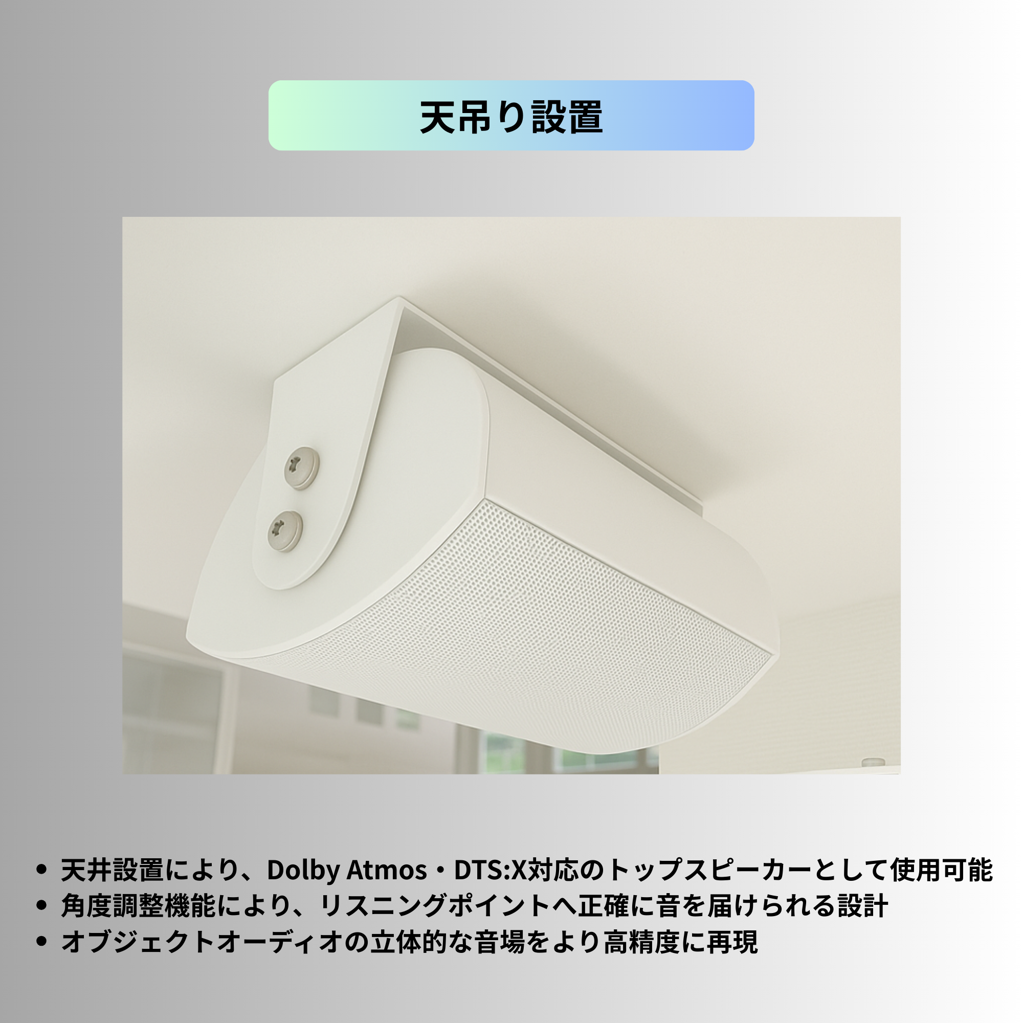 天井に設置することで、Dolby AtmosやDTS:Xといったオブジェクトオーディオ用のトップスピーカーとしてもご利用いただけます。