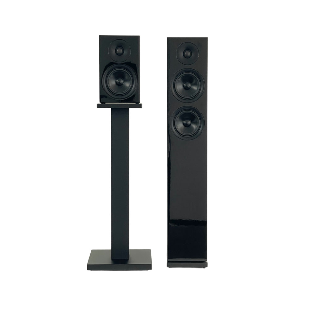 ⚫ 「HF-SPST71B」は、ホームシアターファクトリー製ブックシェルフスピーカー「HF-SP525B」に使用した場合、全体の高さがトールボーイスピーカー「HF-SP525F」とほぼ同じ高さになります。
