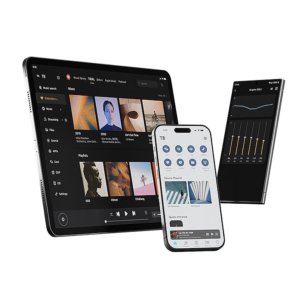 T8は、DSD、PCM、FLAC、APE、WAVなど、様々な高音質オーディオフォーマットに対応し、最大DSD512およびPCM768kHz/32bitまで対応