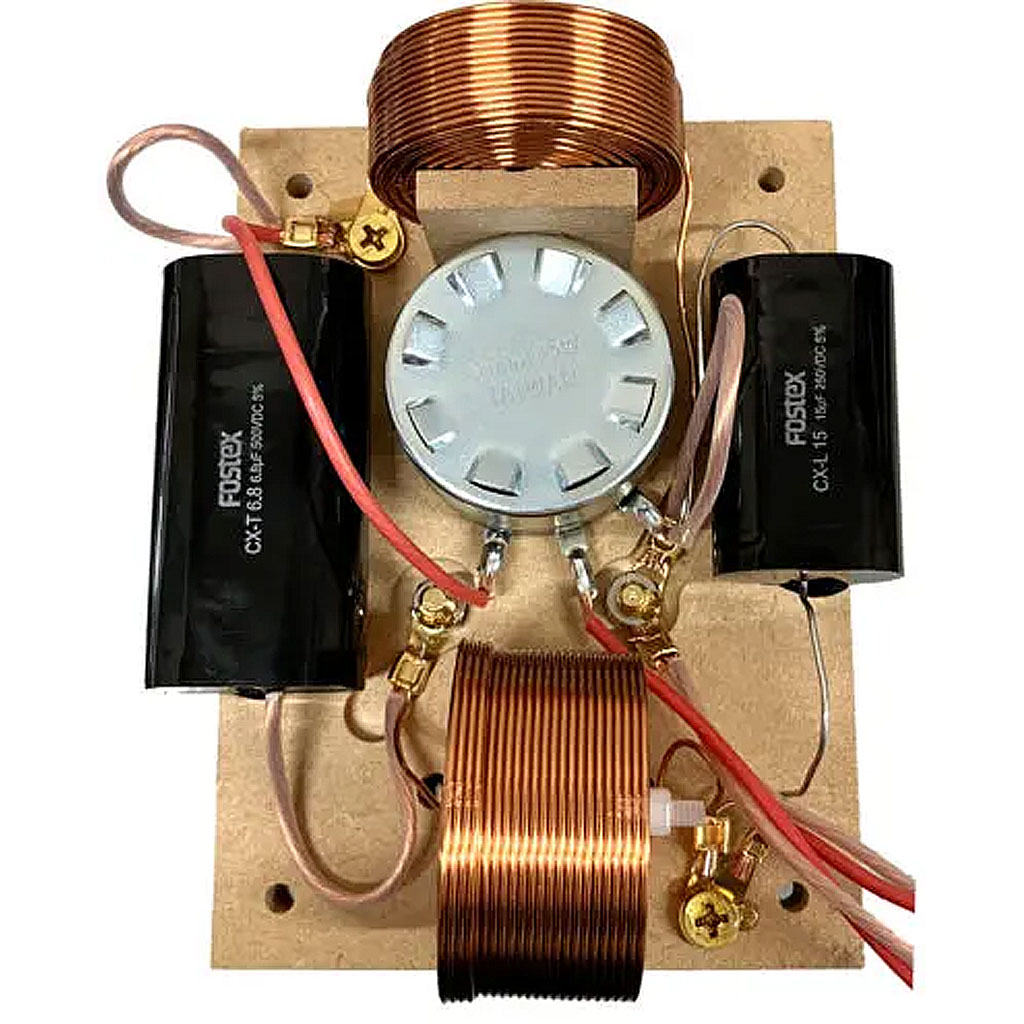 オール12dB/oct.のネットワークは、銅削り出し金メッキターミナルや高音質フィルムコンデンサーと空芯コイルなど高品位な素子を使用。各素子のリード線を金メッキ圧着端子で接続することで、音質阻害要因を徹底して排除しています。また各素子は剛性と内部損失のバランスの良いMDF製ネットワークボードの上に配置して、響きや余韻を抑え過ぎない様に接着固定しています。さらにツイーターは定抵抗型巻き線式アッテネーターにより音圧を調整可能としています。