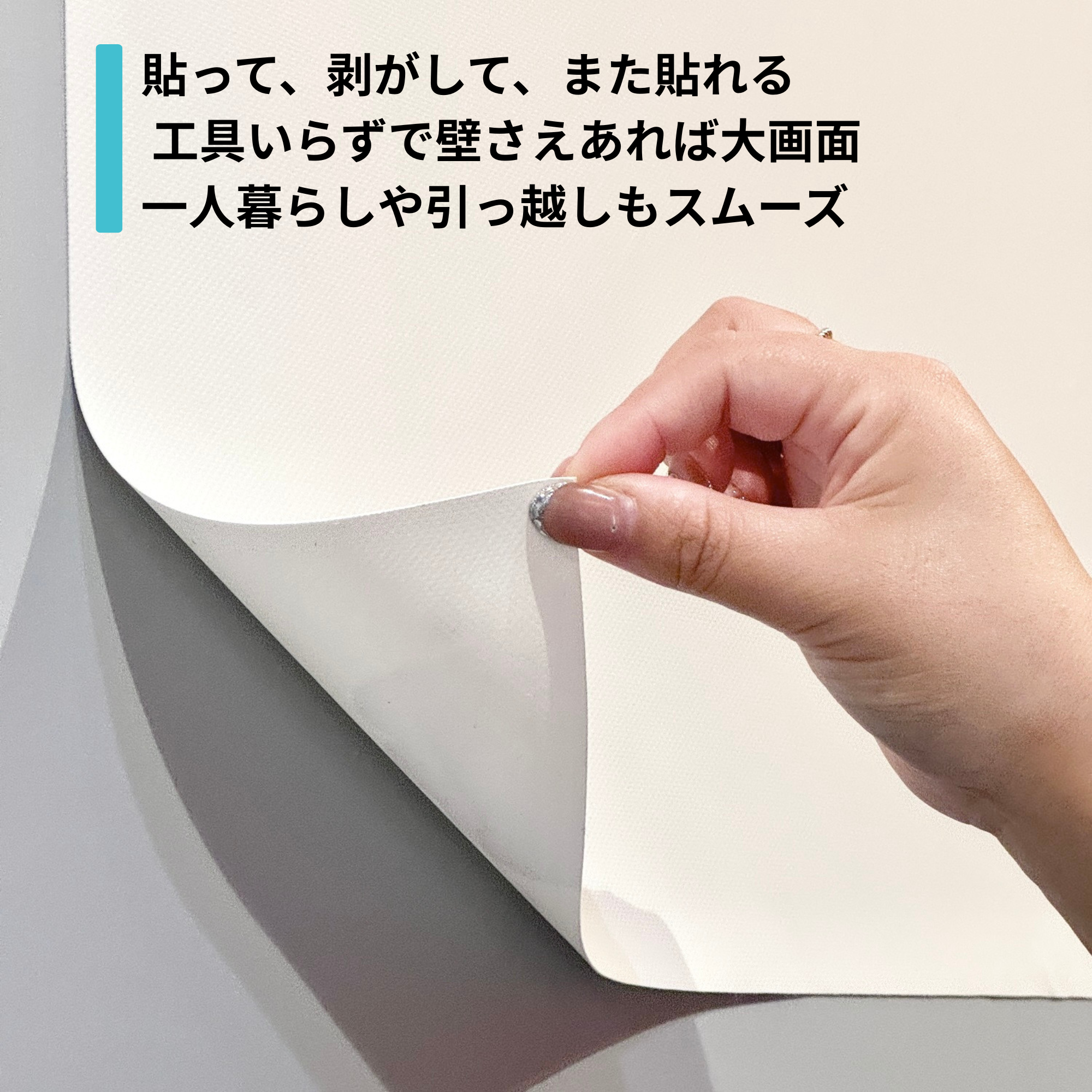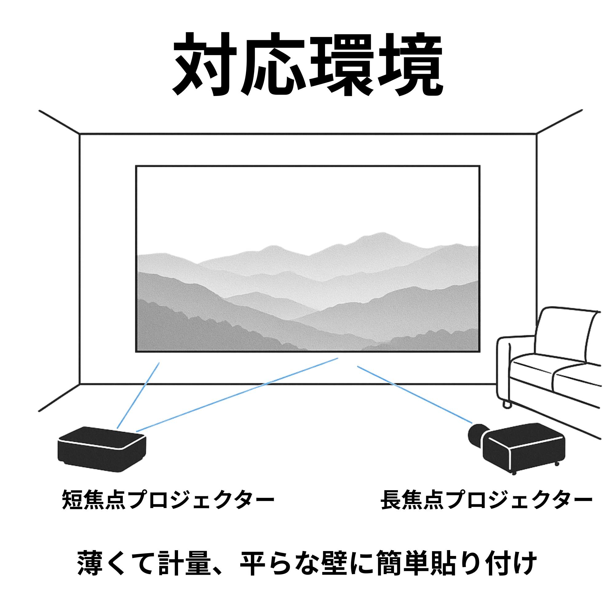 壁などに貼り付けて使用できる102インチの高画質スクリーン平らな面や壁紙の上に張り付けて使用できるホワイトマットタイプのスクリーンです。