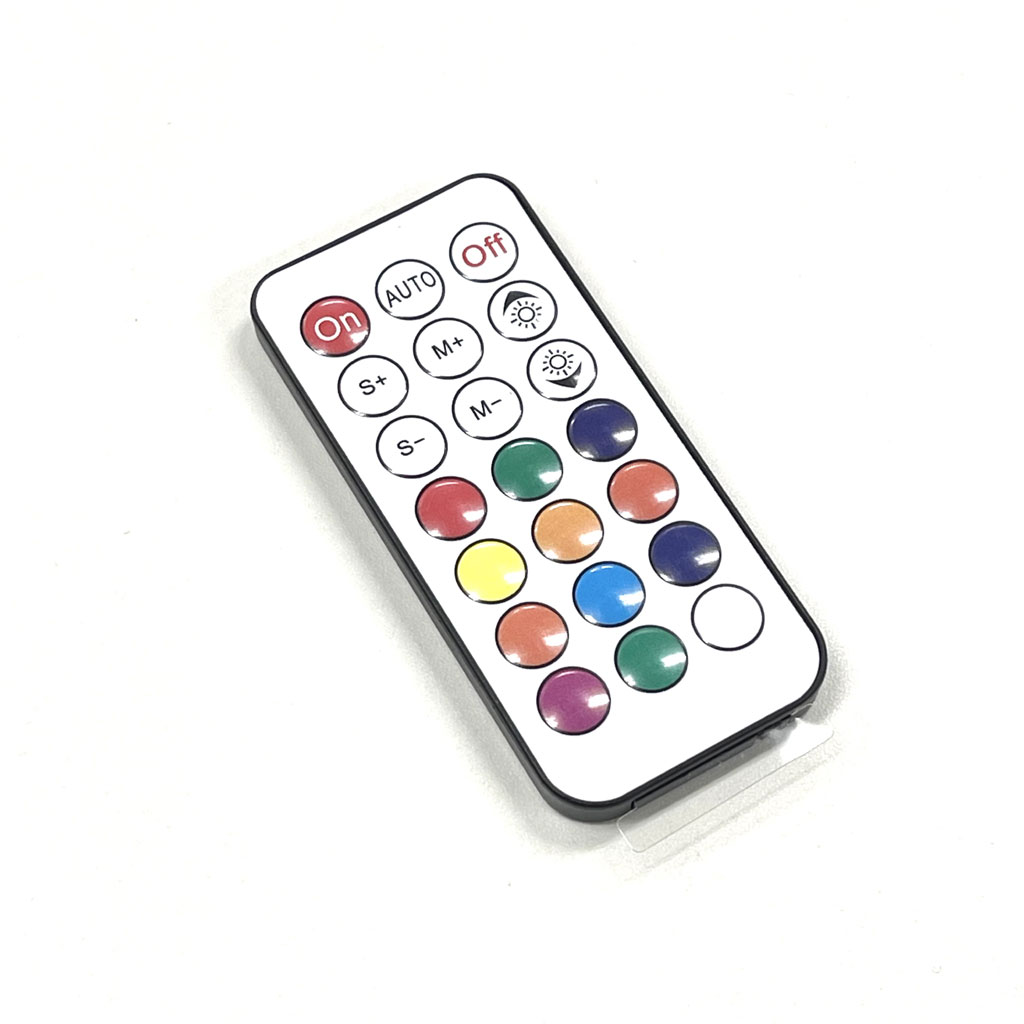12色から選べる単体発光に加え、色が次々に切り替わり流れていく「AUTO」モードも搭載。明るさを切り替える調光に加え、流れる光の速さを調節する事も可能です。