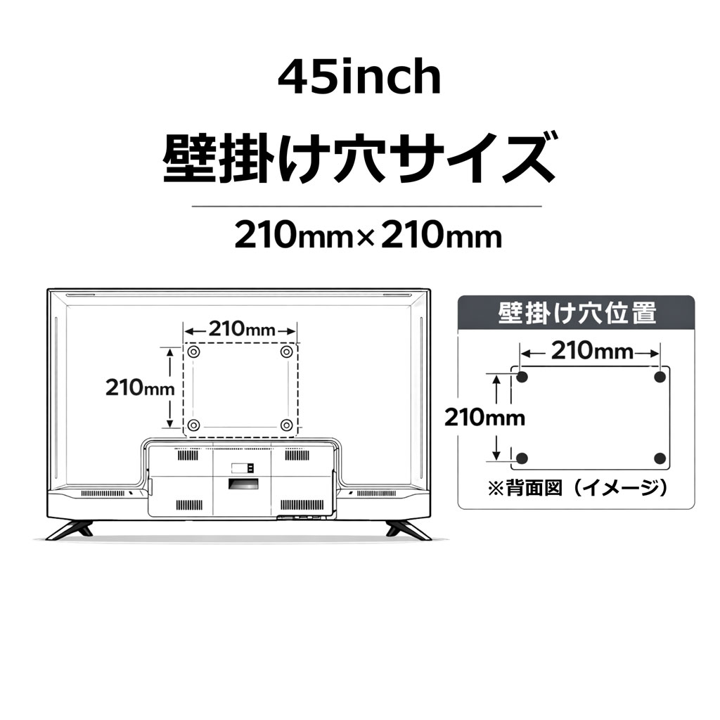 本体背面には横幅21cm、縦幅21cm(穴芯)のビス穴が設けてあり、汎用の壁掛け金具を使用して壁掛け設置をすることが可能です。