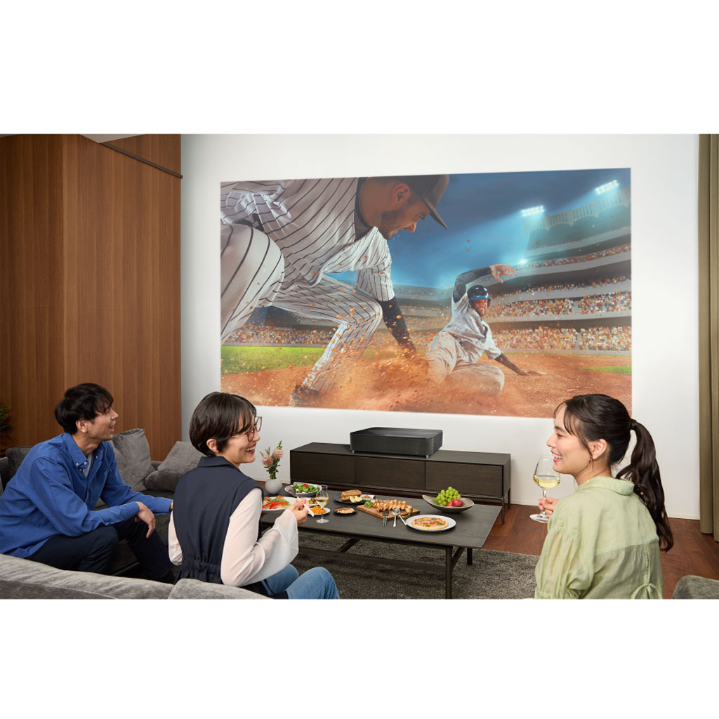 壁際に置くだけ。リビングがエンタメ空間に変わる壁から17.5cmのところに置けば120インチ(2.7×1.5m)の大画面を実現できる超短焦点プロジェクター。4000lmの明るさで、明るいリビングでも高品質映像が楽しめます。家族とのリラックスタイムや、友人を招いてのホームパーティーなど、日常のひとときを特別な時間へと変えてくれます。プロジェクターを起動するだけで、リビングがまるでミニシアターのように早変わり。日常のシーンを、記憶に残るかけがえのない時間に変えられます。